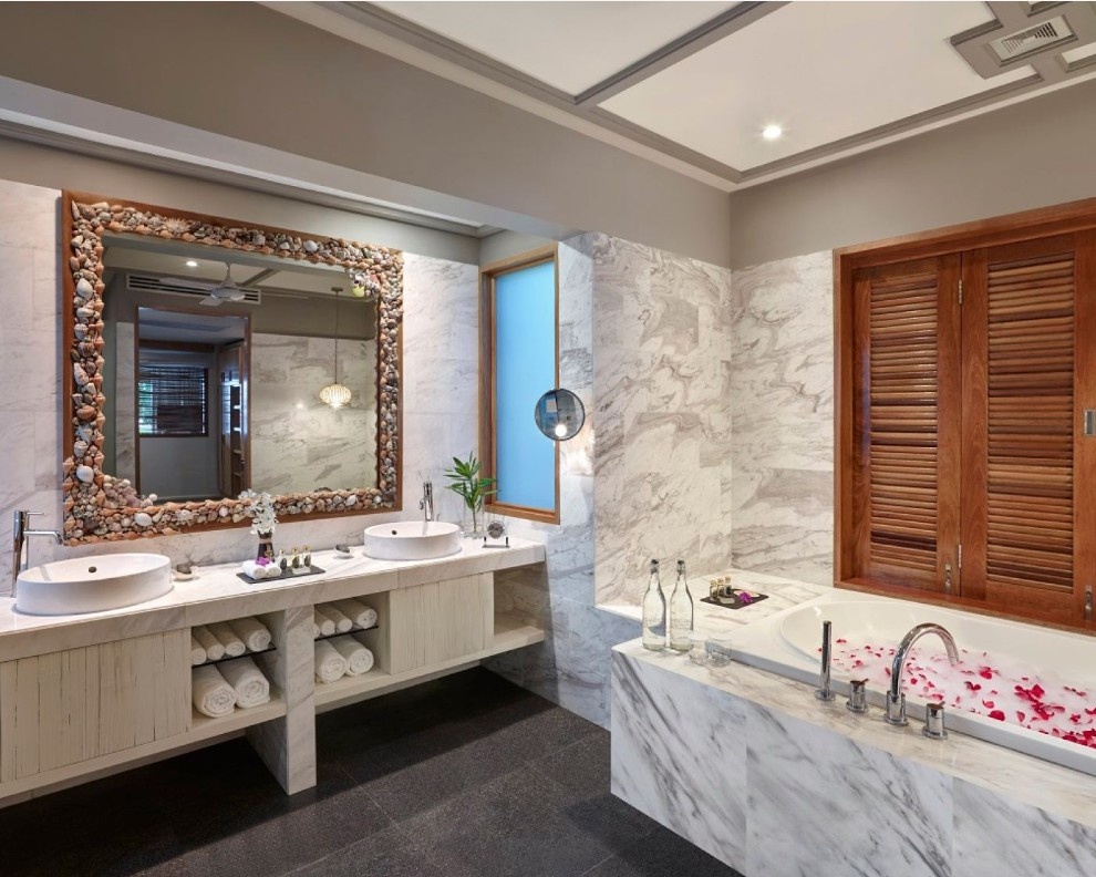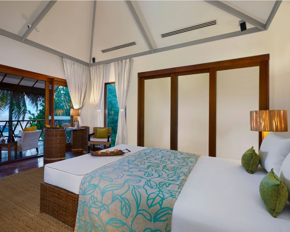 The Nirvana Beach Suite at Taj Coral Reef Resort & Spa, Maldives is a luxurious two-story duplex villa designed for an unforgettable stay. Ideal for honeymooners or families, this suite features two spacious bedrooms and an elegantly furnished living area that opens to breathtaking views of the Indian Ocean. Guests can enjoy a private wooden deck equipped with a plunge pool, sun loungers, and umbrellas, offering a perfect setting for relaxation. The suite also includes a shower cubicle, outdoor shower, bathtubs, and premium Forest Essentials bath amenities. Additional services such as daily housekeeping, 24-hour in-villa dining, and a selection of snacks and beverages (charges apply) are provided to enhance your stay.