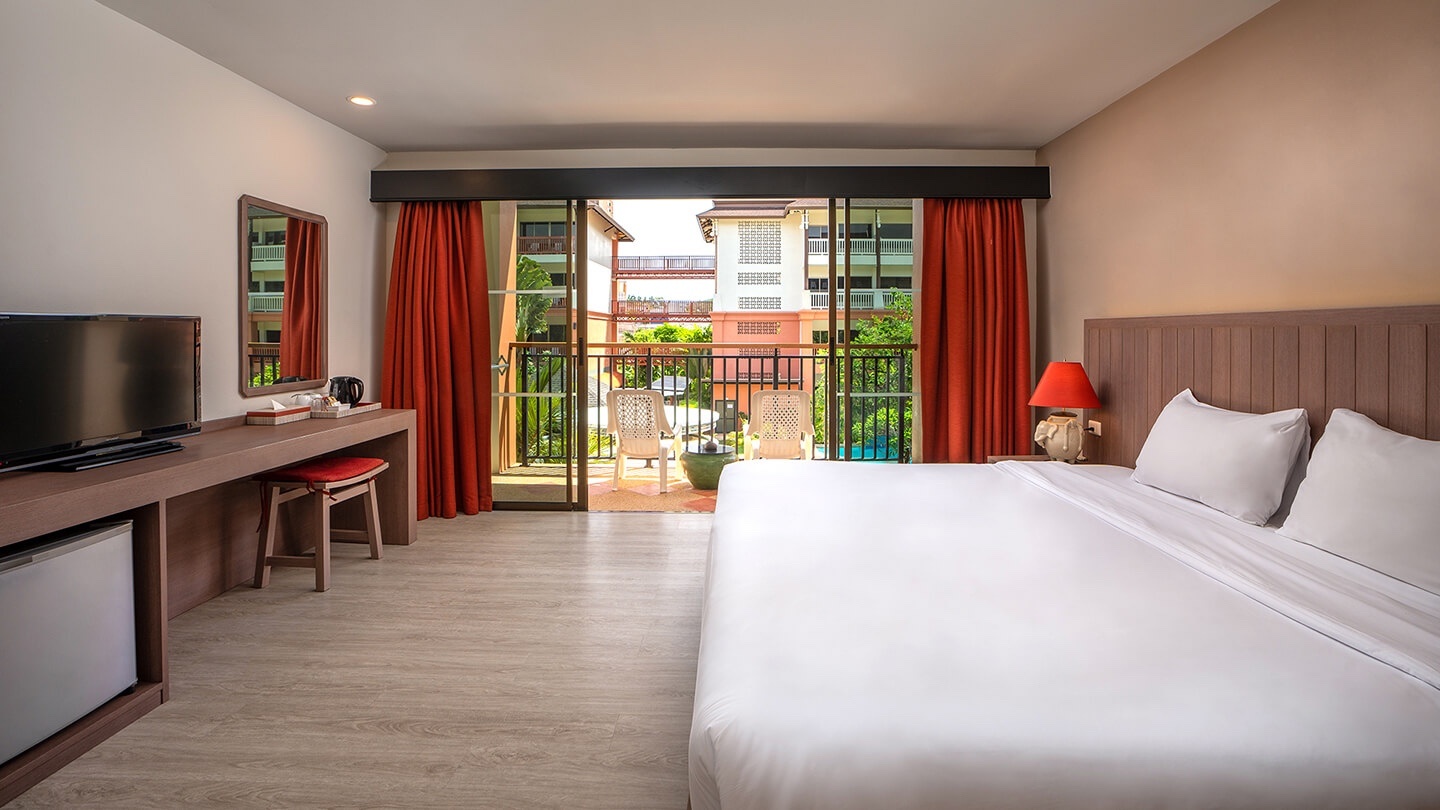 The Sea Breeze Room at Kata Sea Breeze Resort is a spacious 44 sq.m. accommodation featuring a private balcony with views of the garden, pool, or resort entrance. Designed for comfort, it includes modern amenities such as air conditioning, a flat-screen TV, a minibar, and a safety deposit box. The room is ideal for couples or small families seeking a relaxing stay just a short walk from Kata Beach.