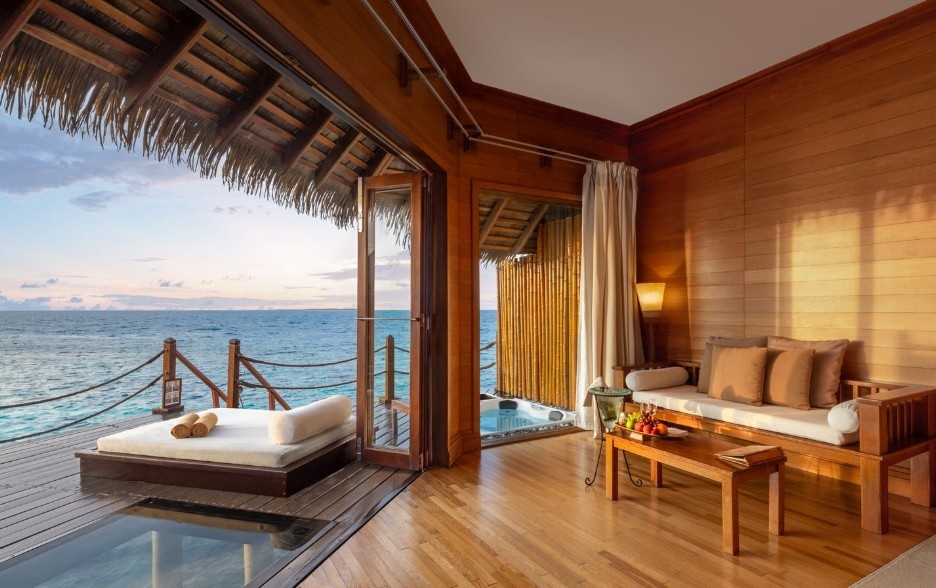 The Sunset Beach Villa at Adaaran Select Meedhupparu offers a picturesque retreat with breathtaking sunset views over the Indian Ocean. Featuring direct beach access, a private sun deck, and modern amenities, this villa is perfect for those seeking a serene and romantic Maldivian escape.