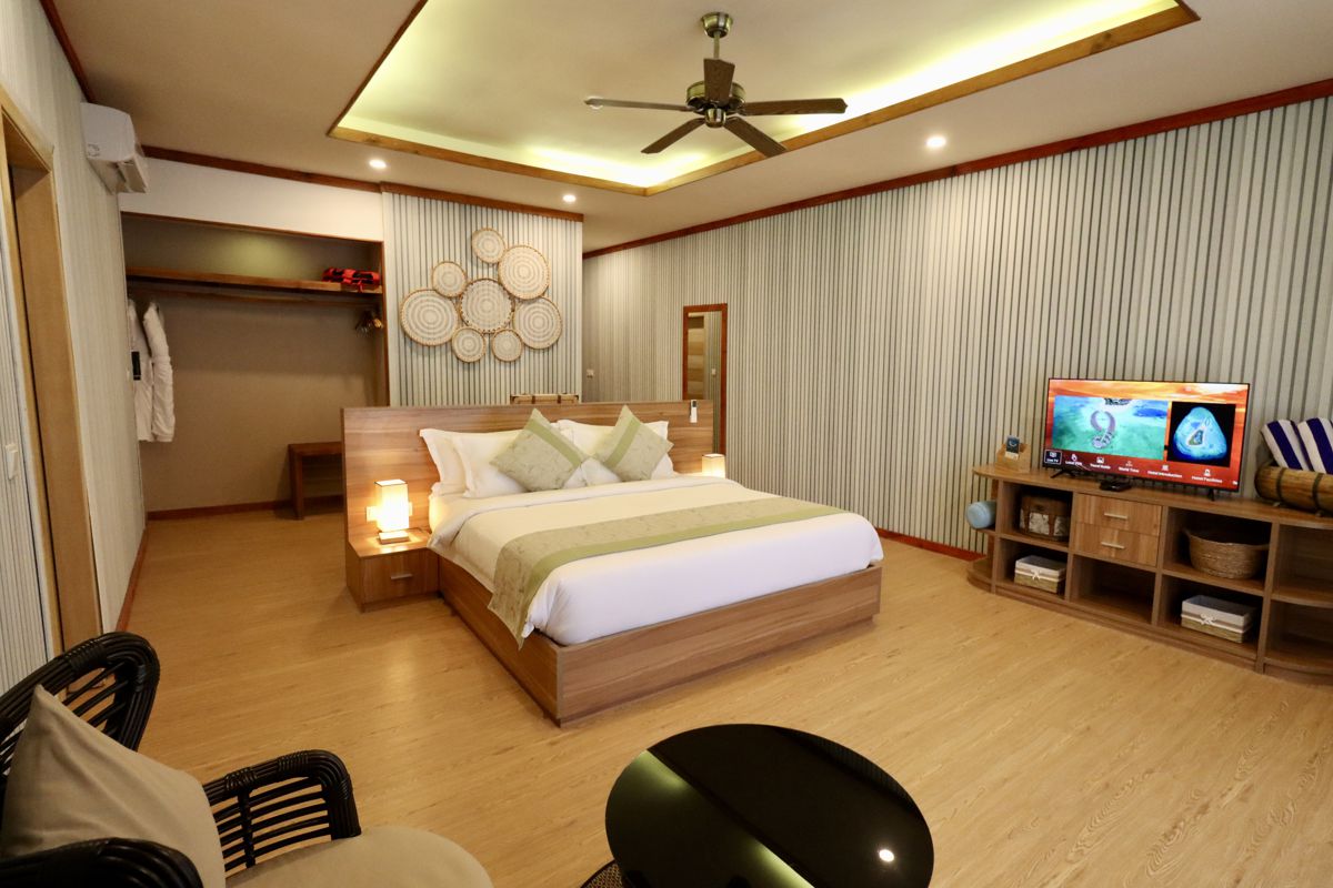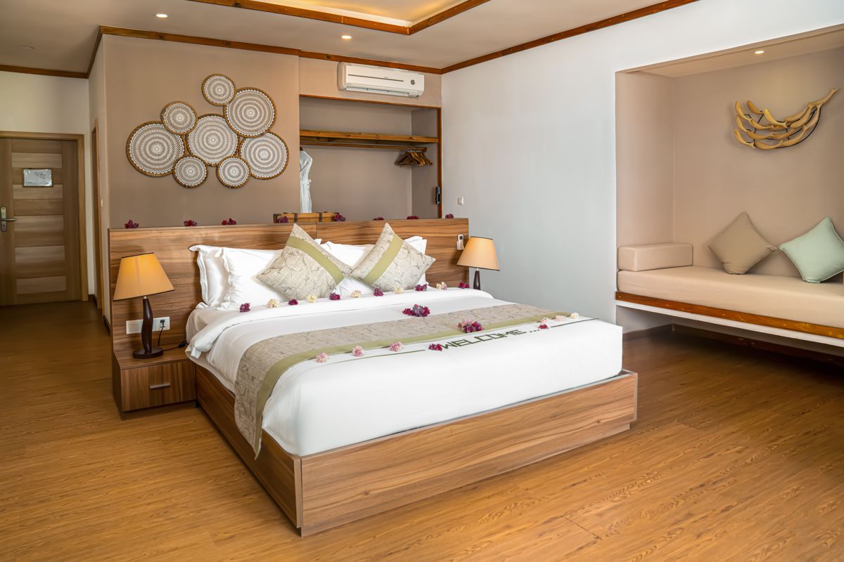 The open-plan living area is spacious and airy, leading to a large outdoor terrace with direct access to the beach. Here, you can relax in the sun, enjoy a meal, or take a refreshing dip in the crystal-clear waters just steps away. With a perfect balance of modern amenities and Maldivian charm, the Two Bedroom Beach Villa offers a serene escape where the beauty of the Maldives is always within reach.